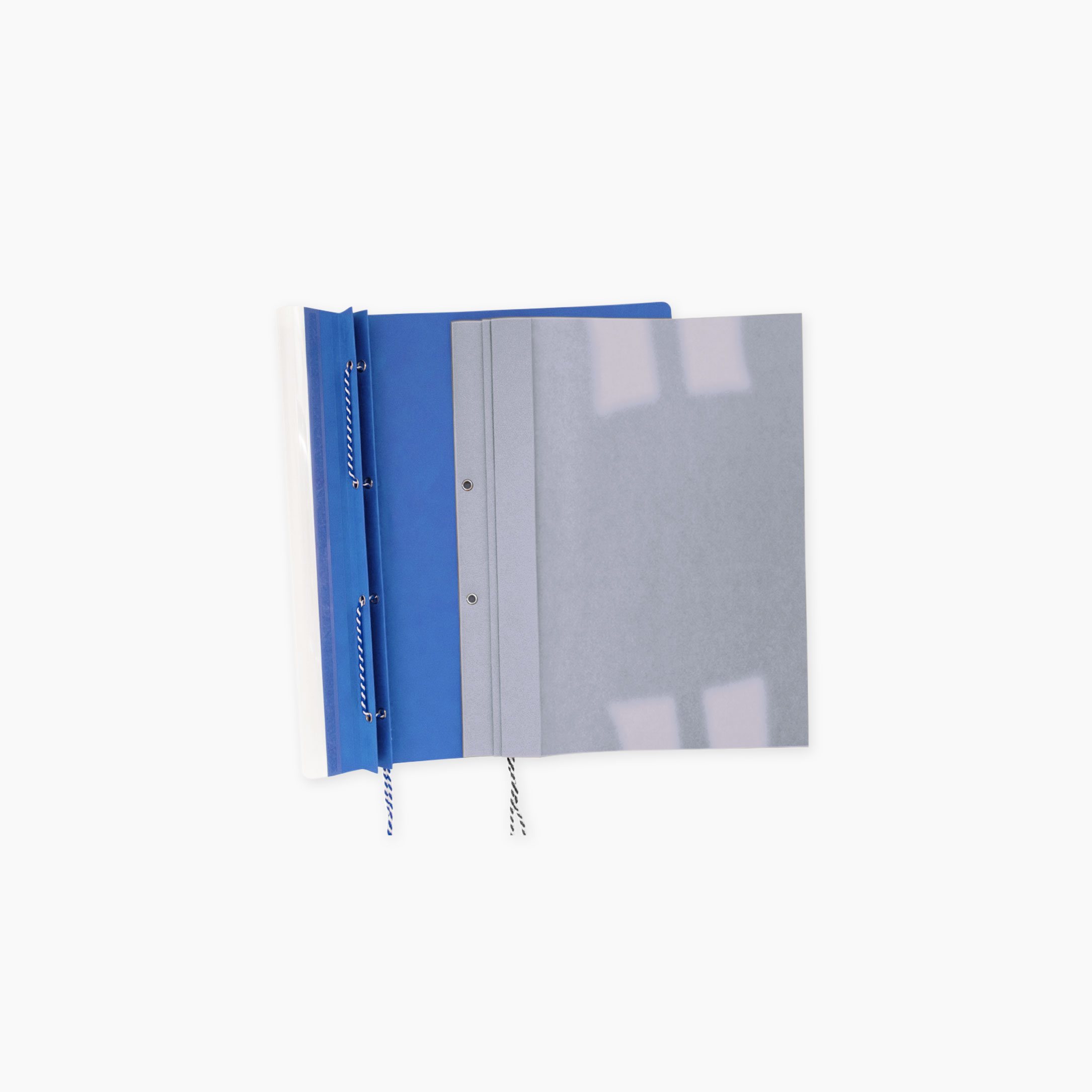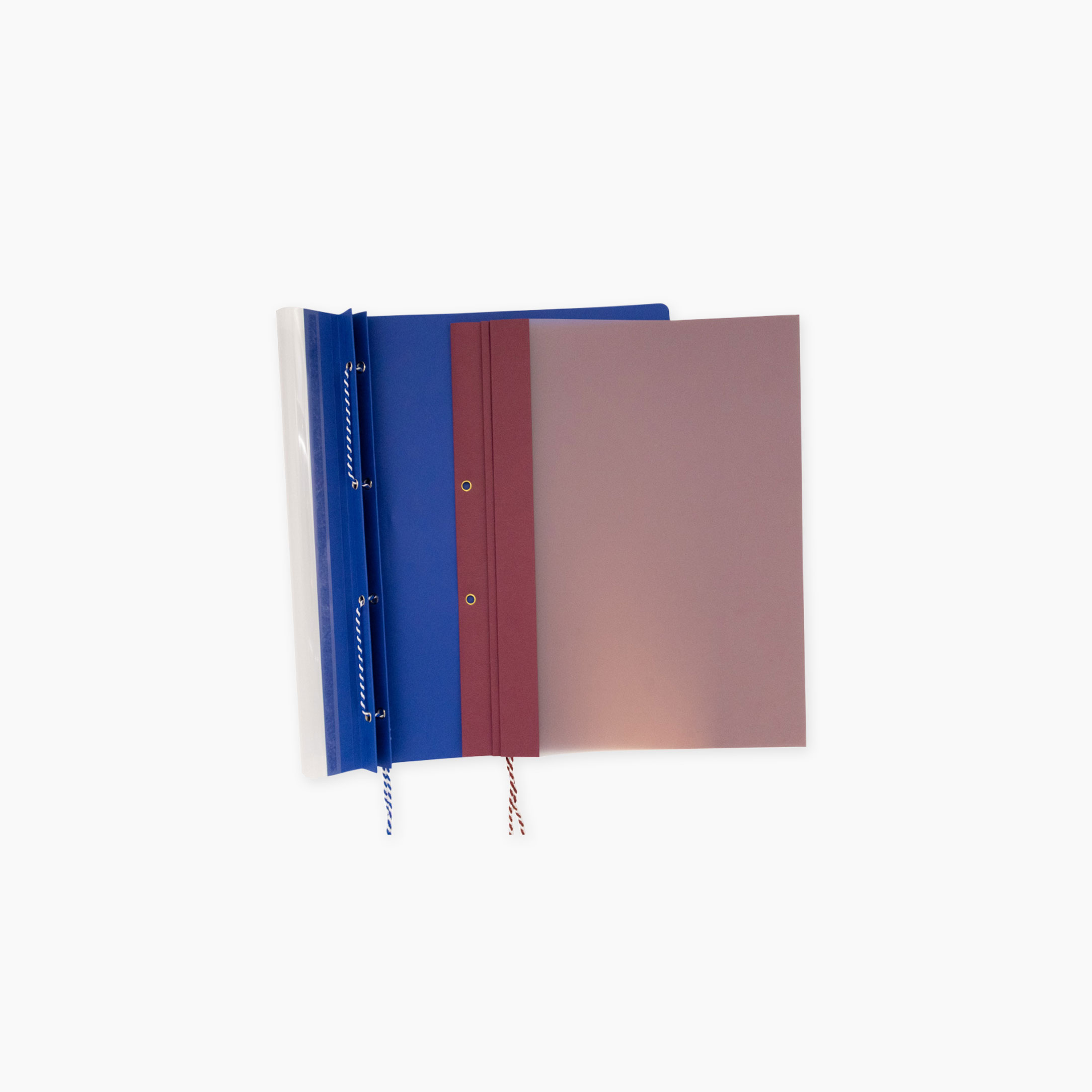 Beispiel: Bilanzmappe (Ösen 8-fach innen, 2-fach aussen) mit Vorderseite (transparent mattiert) und Rückseite (Karton).