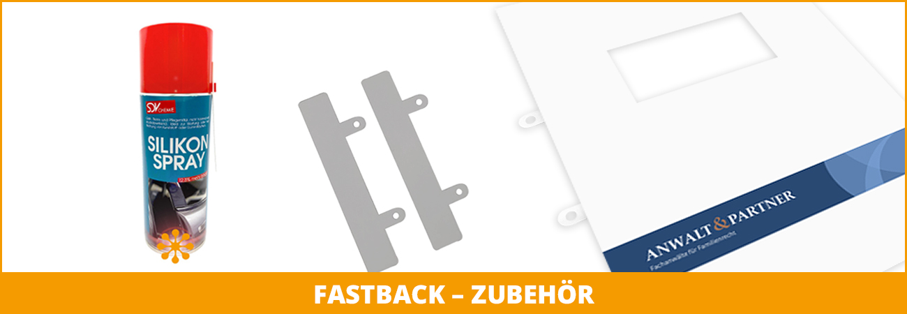 Hier finden Sie Zubehör, Reinigungs- & Pflegemittel oder auch passende Abheftlaschen – geradezu unerlässlich für die effiziente Archivierung Ihrer FASTBACK Bindung – bestellen Sie die passenden Abheftlaschen für Ihre mit FASTBACK gebundenen Dokumente mit!