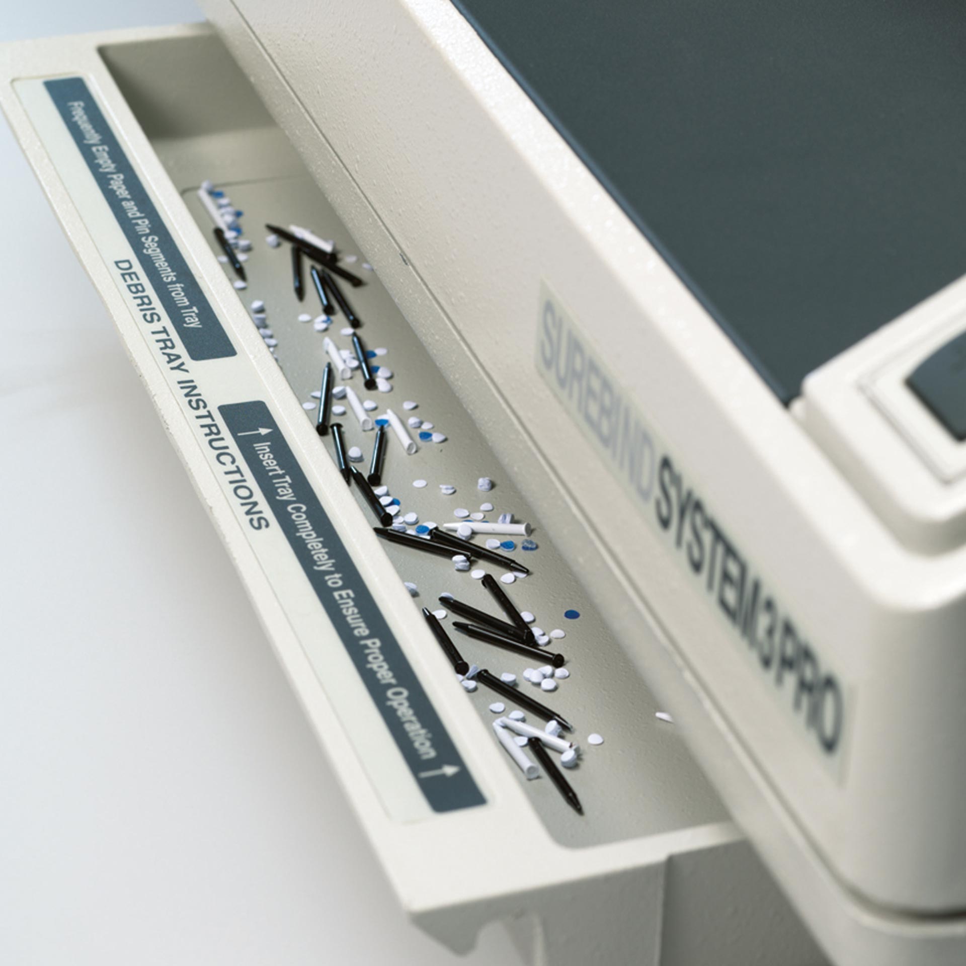 GBC SureBind System 3 Pro, ist ideal geeignet für Großraumbüros, die regelmäßig große Mengen an sicher gebundenen Unterlagen benötigen. Die zu bindende Dokumentensammlung - von bis zu max. 750 Blatt - bindet er problemlos und verfügt über eine elektrische Stanzung (für Blätter bis zu 26 Blatt 80 g/m²). Bindet Dokumente im Format A5 mit A5 Strips und A4 Hoch- und A3 Querformate mit A4 Strips. Die sichere Bindung wird durch das Zusammenschweißen von zwei Binde-Strips erreicht, um einen permanenten Binderücken zu erzeugen.