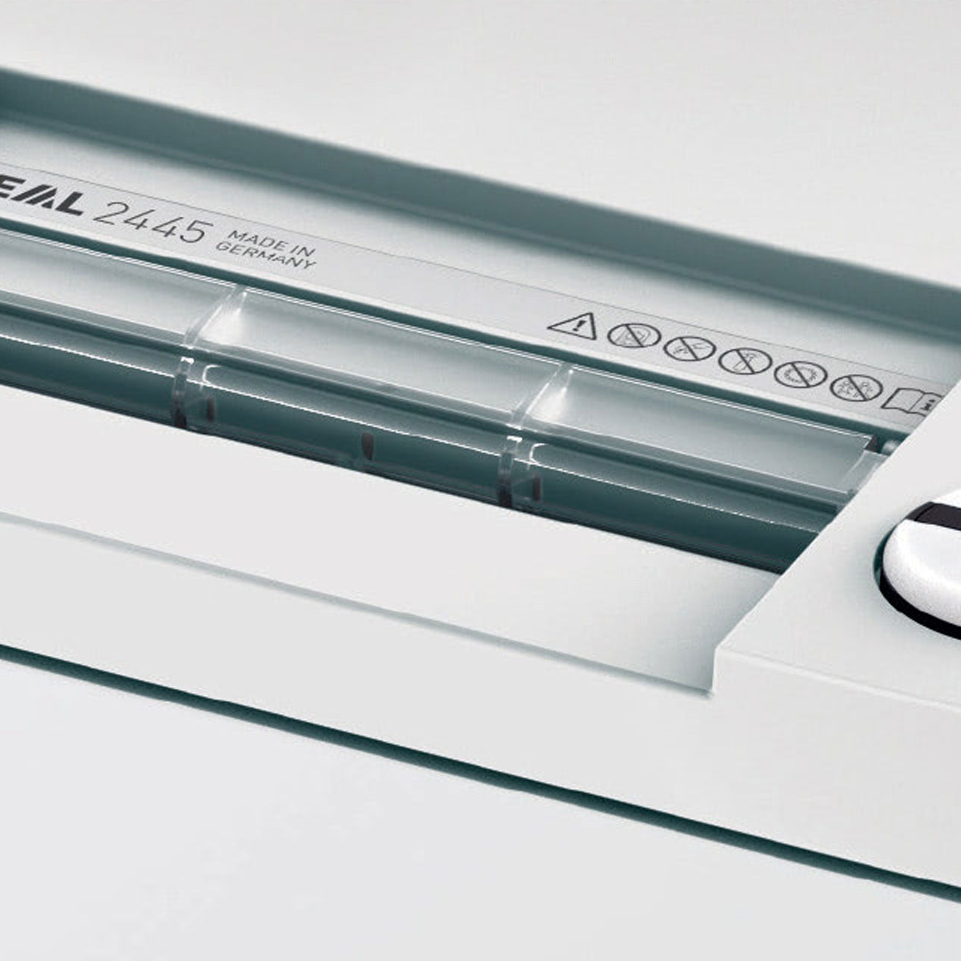 SPS-Sicherheitspaket (Safety Protection System): Patentierte, elektronisch kontrollierte Sicherheitsklappe in der Zuführöffnung als zusätzliches Sicherheitselement. Mehrfunktions-Schaltelement EASY-SWITCH mit integrierter Bedienerführung durch Farbsignale und Leuchtsymbole. Reversierautomatik mit automatischer Abschaltung, verhindert Papierstaus.