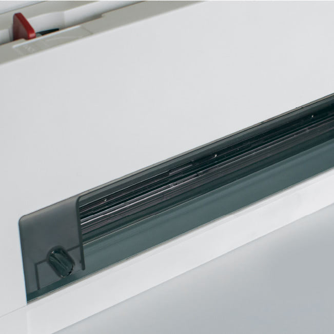 Der Rückanschlag ist beidseitig einsetzbar und ermöglicht so das exakte Schneiden auf Längen zwischen 45 und 300 mm. Über die seitlich angebrachte Maßskala lässt sich jedes Maß millimetergenau schneiden. Die transparente Sicherheitsklappe ist Papierführung und Eingriffschutz zugleich. Der optische Schnittandeuter zeigt die Schnittlinie an und ermöglicht ein präzises Schneiden nach Schnittmarkierungen. Der Schnittandeuter kann manuell oder automatisch über das Öffnen des Schneidetisches aktiviert werden. Der einfache Transport erfolgtüber den Tragegriff. Die Tiefe bei geschlossenem Anlagetisch liegt bei kompakten 115 mm.
