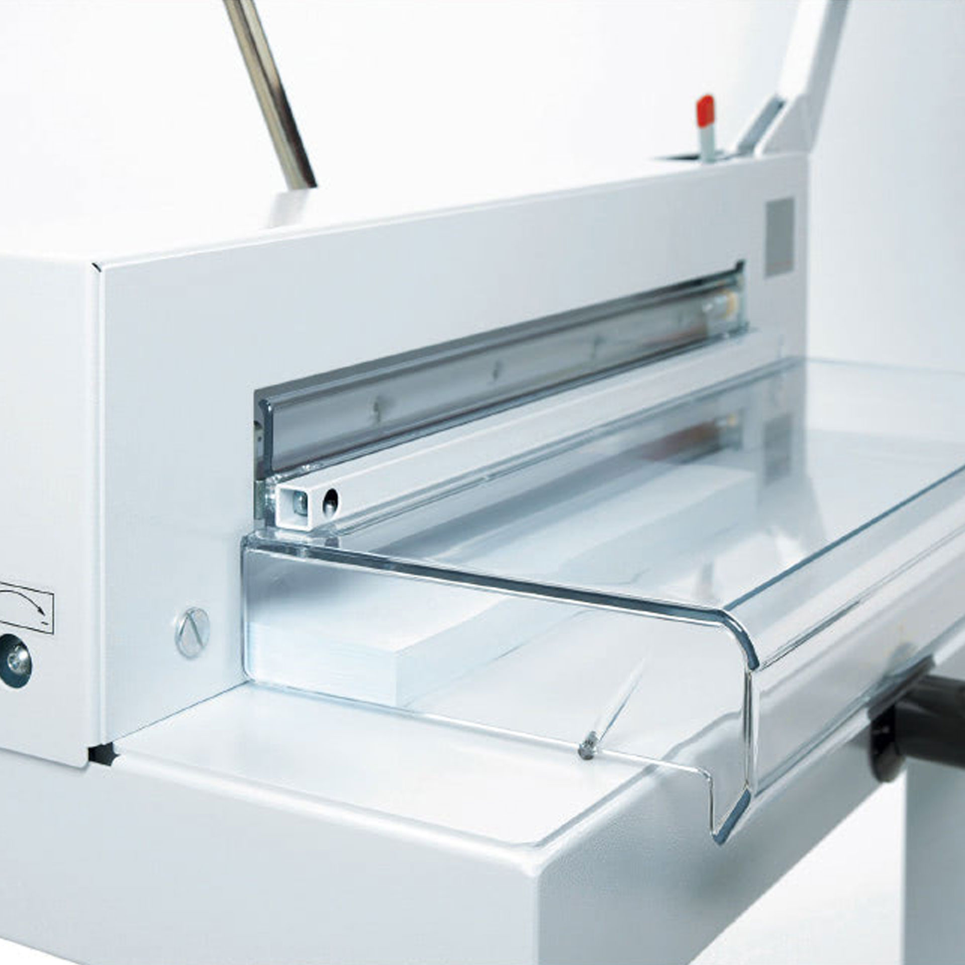 Seitenanschlag mit Maßskala, spindelgeführter Rückanschlag. Maß-Feineinstellung über Skalenring an der Rückanschlagkurbel. Hochwertiges Messer aus Qualitäts-Messerstahl. Vollstahl-Messerträger. Gehärtete Messerführungen. Stabile Ganzmetallkonstruktion.
