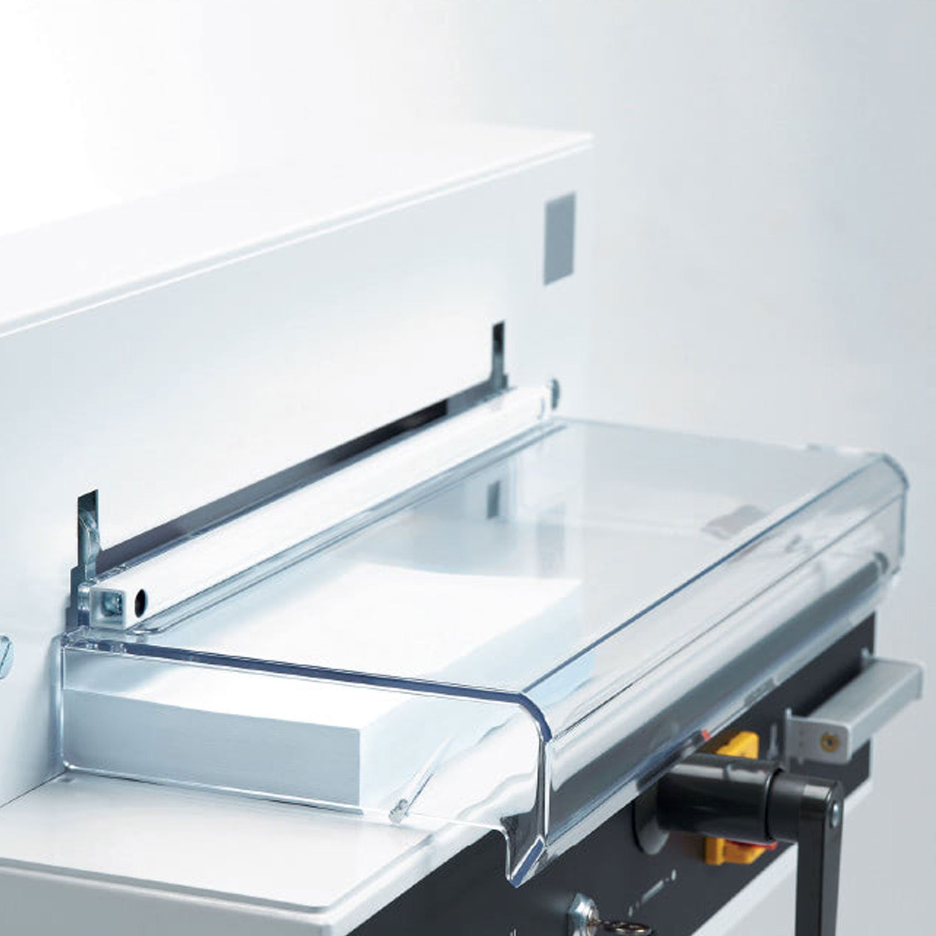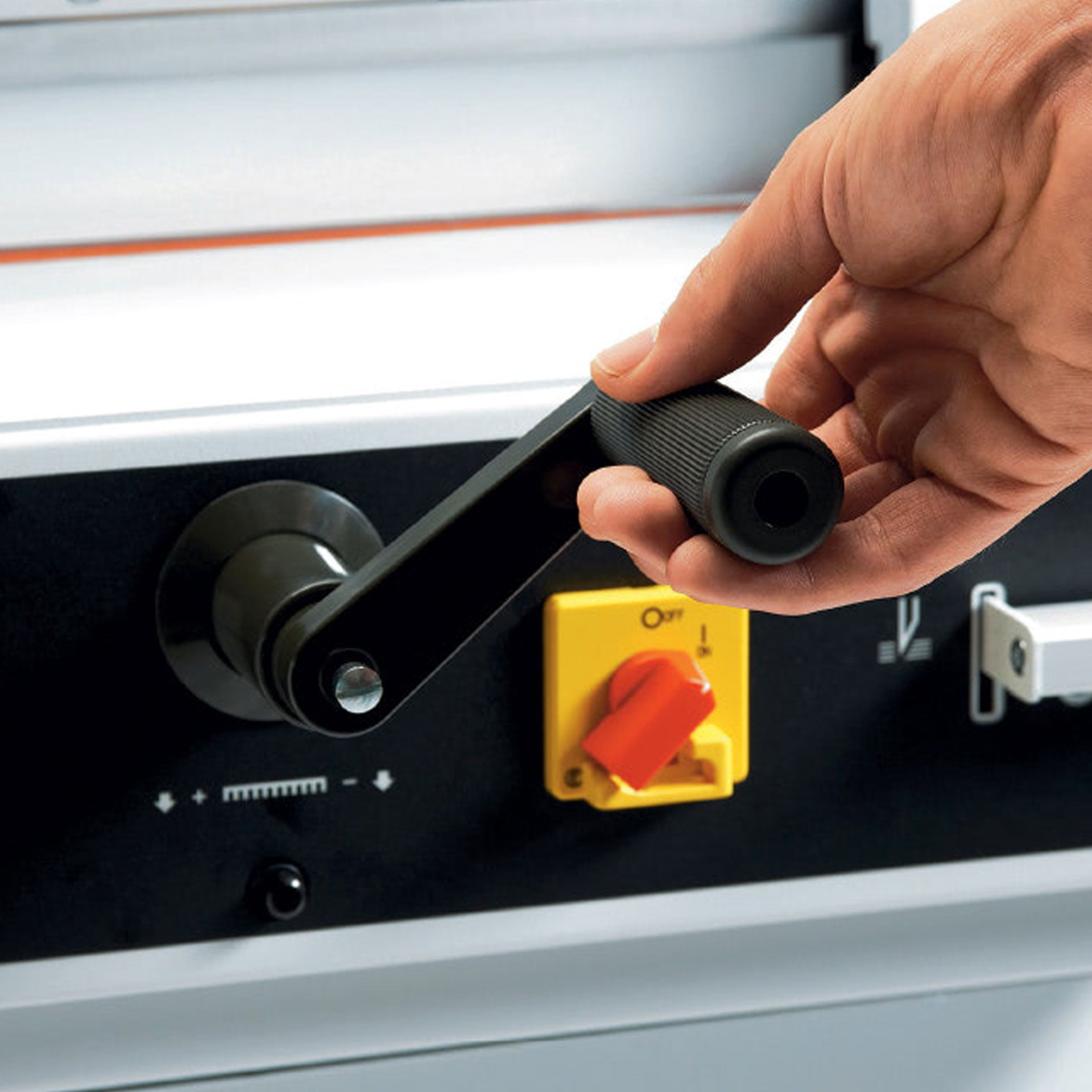Mit patentierter EASY-CUT Schnittauslösung. Besonders sicher durch SCS-Sicherheitspaket (Safety Cutting System): Elektronisch kontrollierte schwenkbare Sicherheitsvorrichtung mit Schnittsperre am Vordertisch (Messer wird nur bei geschlossener Sicherheitsvorrichtung entriegelt). Transparente Sicherheitsvorrichtung auf dem Rücktisch. Hauptschalter und Sicherheitsschloss, Zweihand-Schnittauslösung.