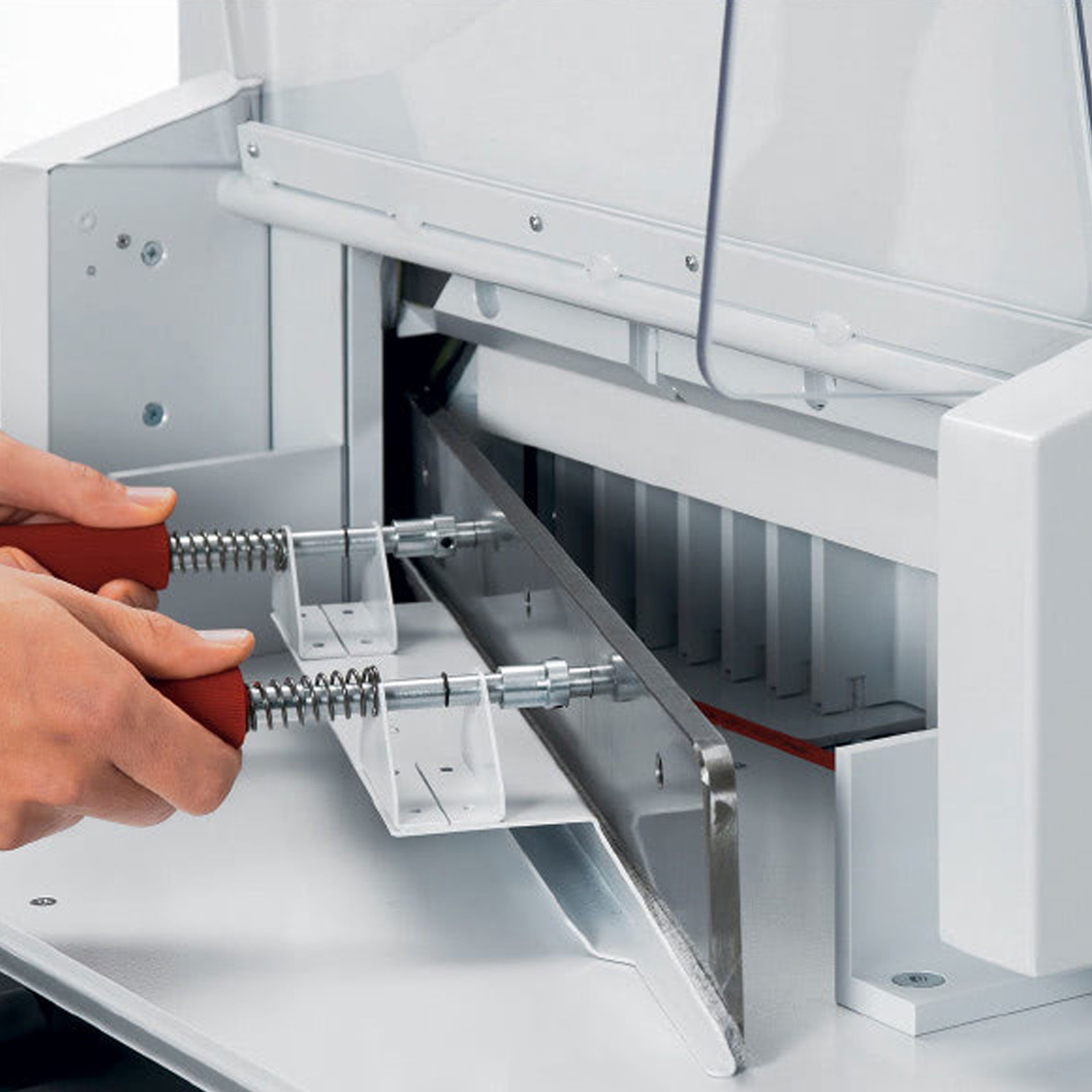 Hochwertiges Messer aus Qualitäts-Messerstahl. Vollstahl-Messerträger. Gehärtete, einstellbare Messerführungen. Optischer Schnittandeuter mit Leuchtdioden (LED). Je zwei Seitenanschläge auf Vorder- und Rücktisch. Nach 30 Minuten schaltet die Maschine automatisch in den Stromsparmodus.