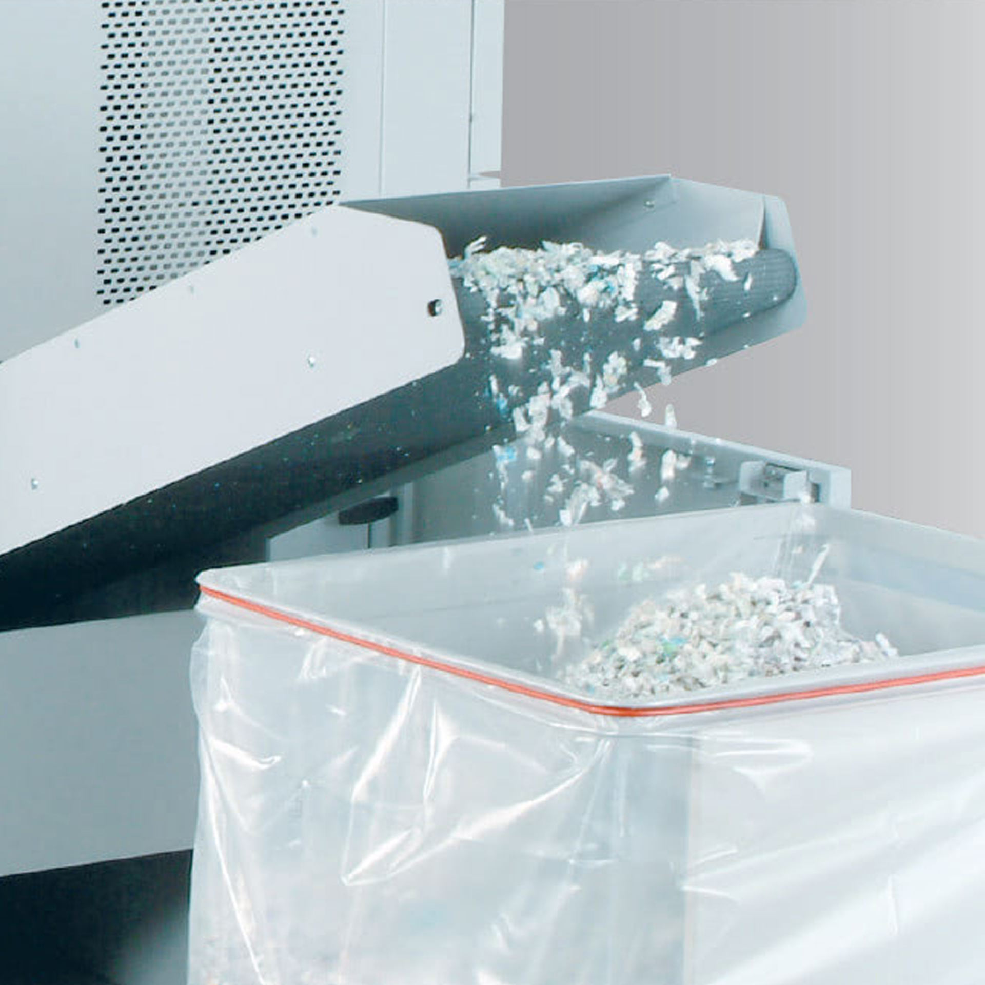 Großmengen Aktenvernichter zum Vernichten kompletter Aktenordner. Dieser hochwertige Aktenvernichter für große Mengen hat eine Arbeitsbreite von 500 mm. Ein großer Zuführtisch mit Transportband und elektrisch gesichertes Schutzgitter im Arbeitsbereich sowie ein übersichtliches Bedienfeld mit Drucktastern für Vorwärtslauf/Stopp/Rückwärtslauf ermöglichen komfortables Arbeiten. Für die erhöhte Sicherheit gibt es zusätzlich ein Sicherheitsschloss mit Schlüssel sowie einen Haupt- und Not-Aus-Schalter.