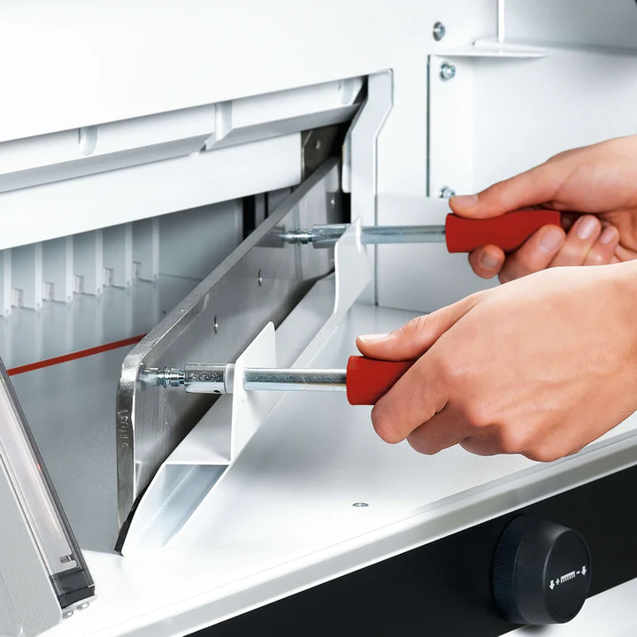 Der Messerwechsel erfolgt über eine sichere Vorrichtung mit verdeckter Schneide, ohne die Maschine öffnen zu müssen. Die Massivkonstruktion aus Metall, nachjustierbare Führungen und der Vollstahl-Messerträger gewährleisten eine dauerhaft hohe Schneidpräzision und gute Reparierbarkeit. Serienmäßig ist der IDEAL 5260mit Untergestell, Papierablage, Werkzeughalter und Stapelwinkel ausgestattet.