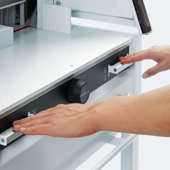 Der Rückanschlag wird über das Touchpad gesteuert und lässt sich digital auf Zehntelmillimeter genau einrichten. Maße können wahlweise in Zentimetern oder Zoll angezeigt werden. Für wiederkehrende Schneidaufgaben stehen 99 Programme mit je 99 Schritten bereit. Kettenmaße, automatische Set-Funktion und vorprogrammierte Fixmaße für gängige DIN-Formate unterstützen einen effizienten Workflow. Das elektronische Handrad bietet eine feinfühlige manuelle Einstellung.