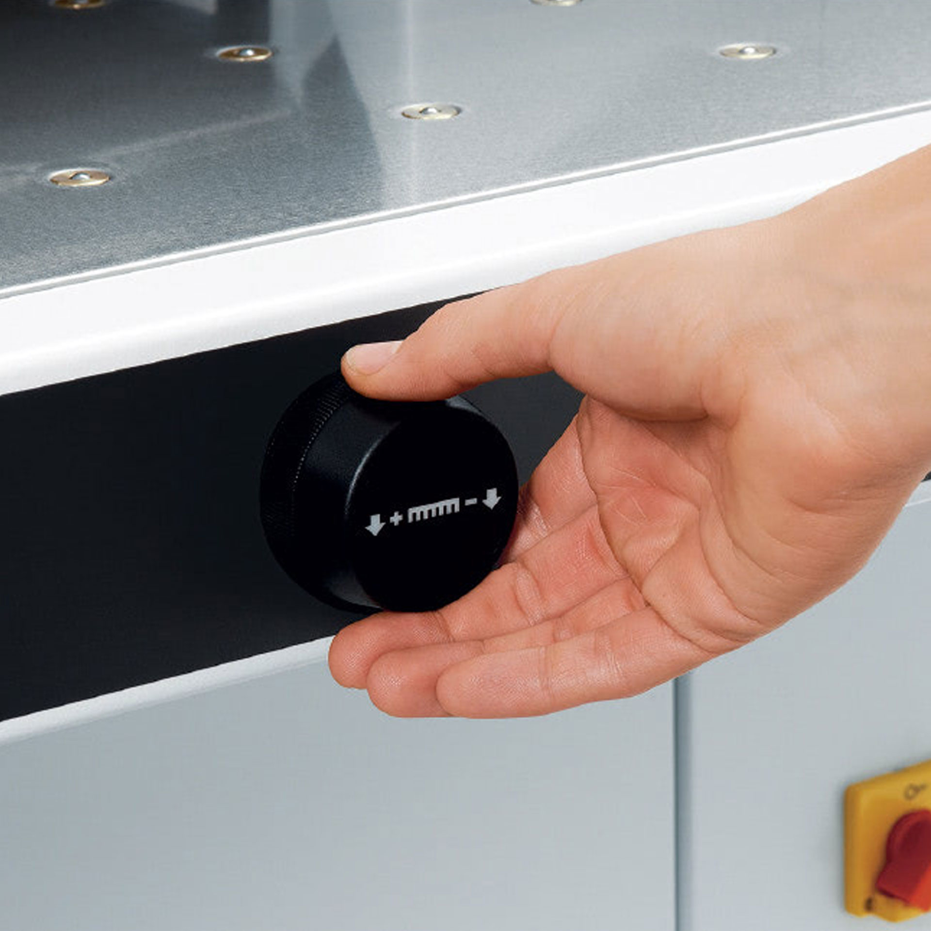 Abschließbarer Hauptschalter, 24V-Steuerung. Messerwechselvorrichtung mit abgedeckter Messerschneide. Nach 30 Minuten schaltet die Maschine automatisch in den Stromsparmodus.