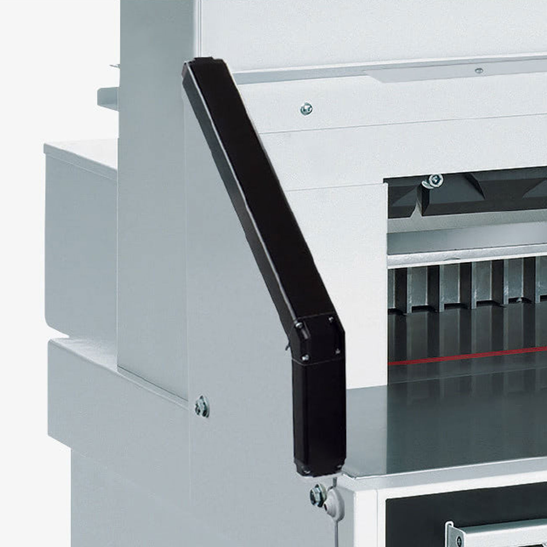 SCS-Sicherheitspaket: Sicherheitslichtschranke für den gesamten Arbeitsbereich, Sicherheitsabdeckung auf Rücktisch, Sicherheits-Zweihand-Schnittauslösung EASY-CUT mit Gleichzeitigkeitssteuerung und Wiederholsperre. Automatischer Rücklauf von Messer und Pressbalken aus jeder Position.