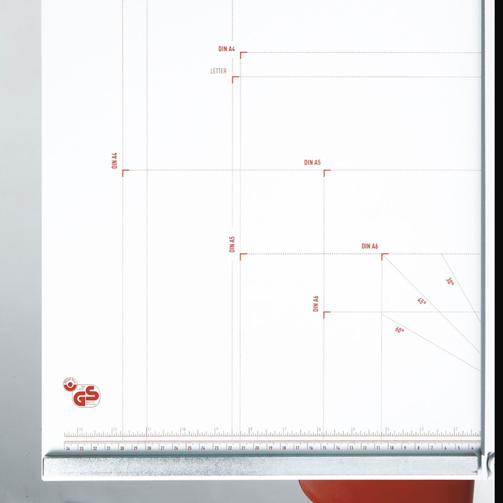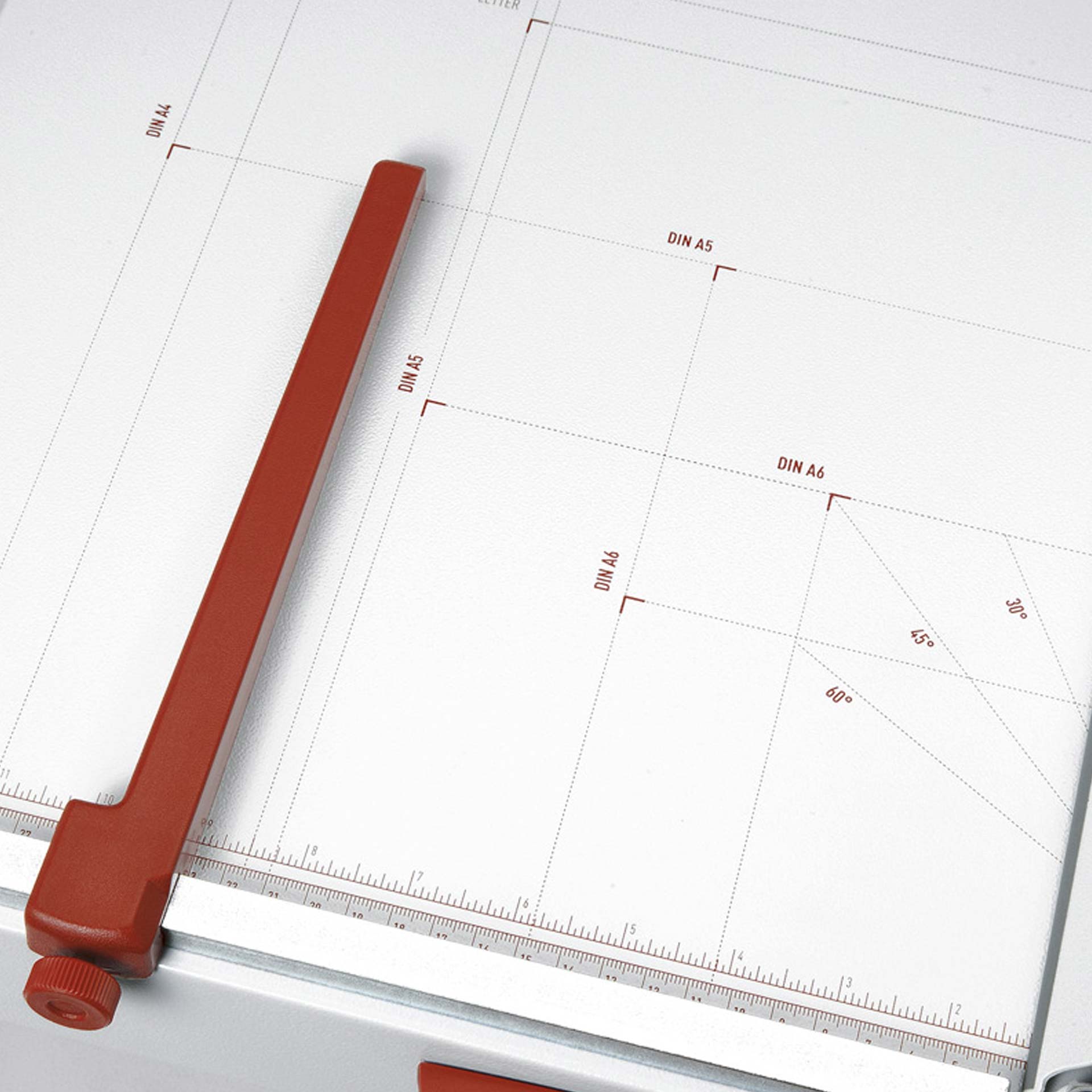 Maßskala in Millimeter und Zoll. Papierformate von DIN A3 bis DIN A6 und amerikanische Papierformate sowie verschiedene Winkelmarkierungen auf dem Schneidetisch. Gummifüße für sicheren Stand.