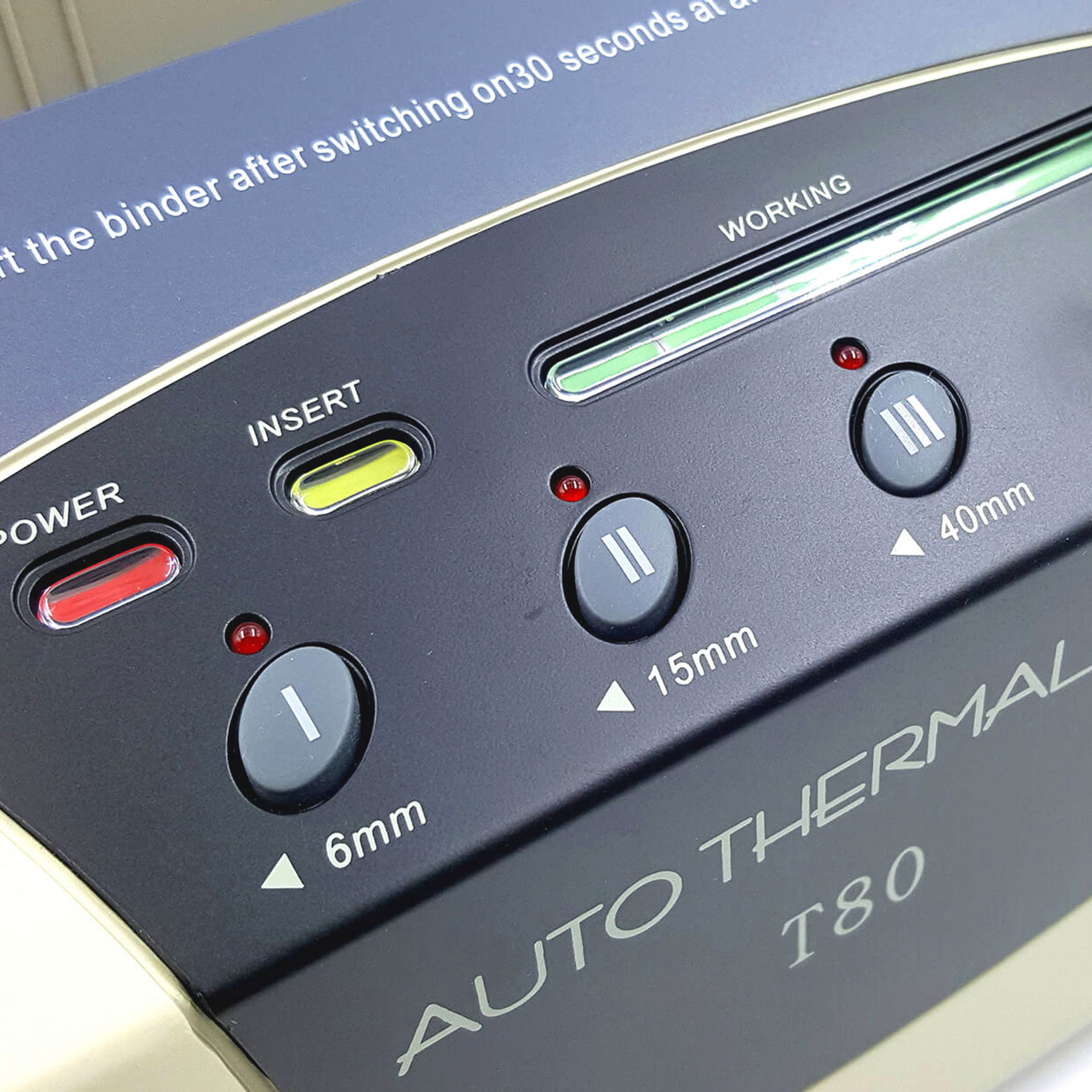 Ein automatischer Bindestart ist dank Lichtschranke und automatischem Anpassen des Bindeschachts an die eingelegten Thermomappen möglich. Die Abkühlphase, die durch eine Abkühlvorrichtung mit drei Kühlventilatoren unterstützt wird, gewährleistet einen soliden und zügigen Thermobindevorgang. Über die Statusanzeige wird man jederzeit über den Bindestatusfortschritt der T80 informiert.