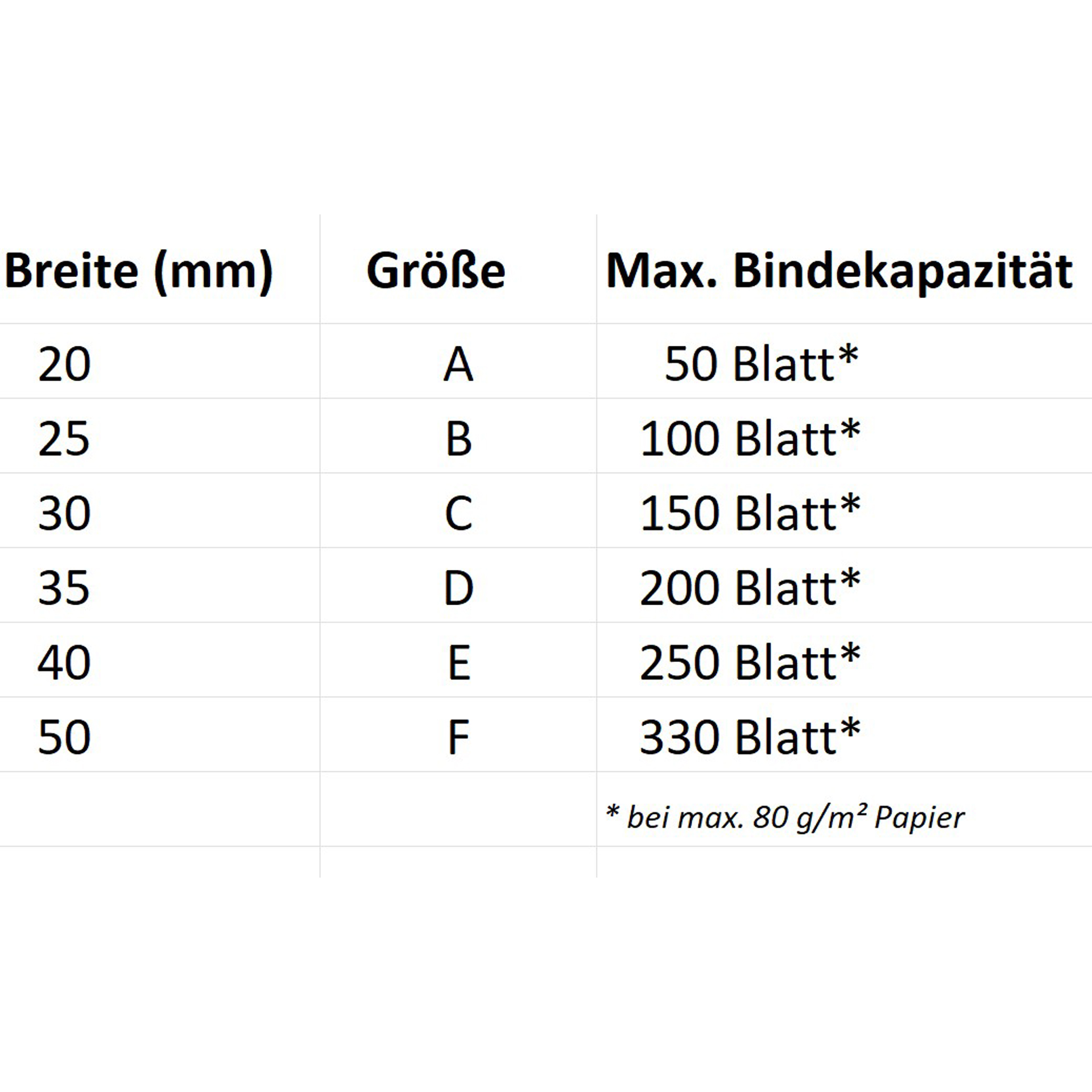 | Breite (mm) | Größe | Bindekapazität (Blatt) |