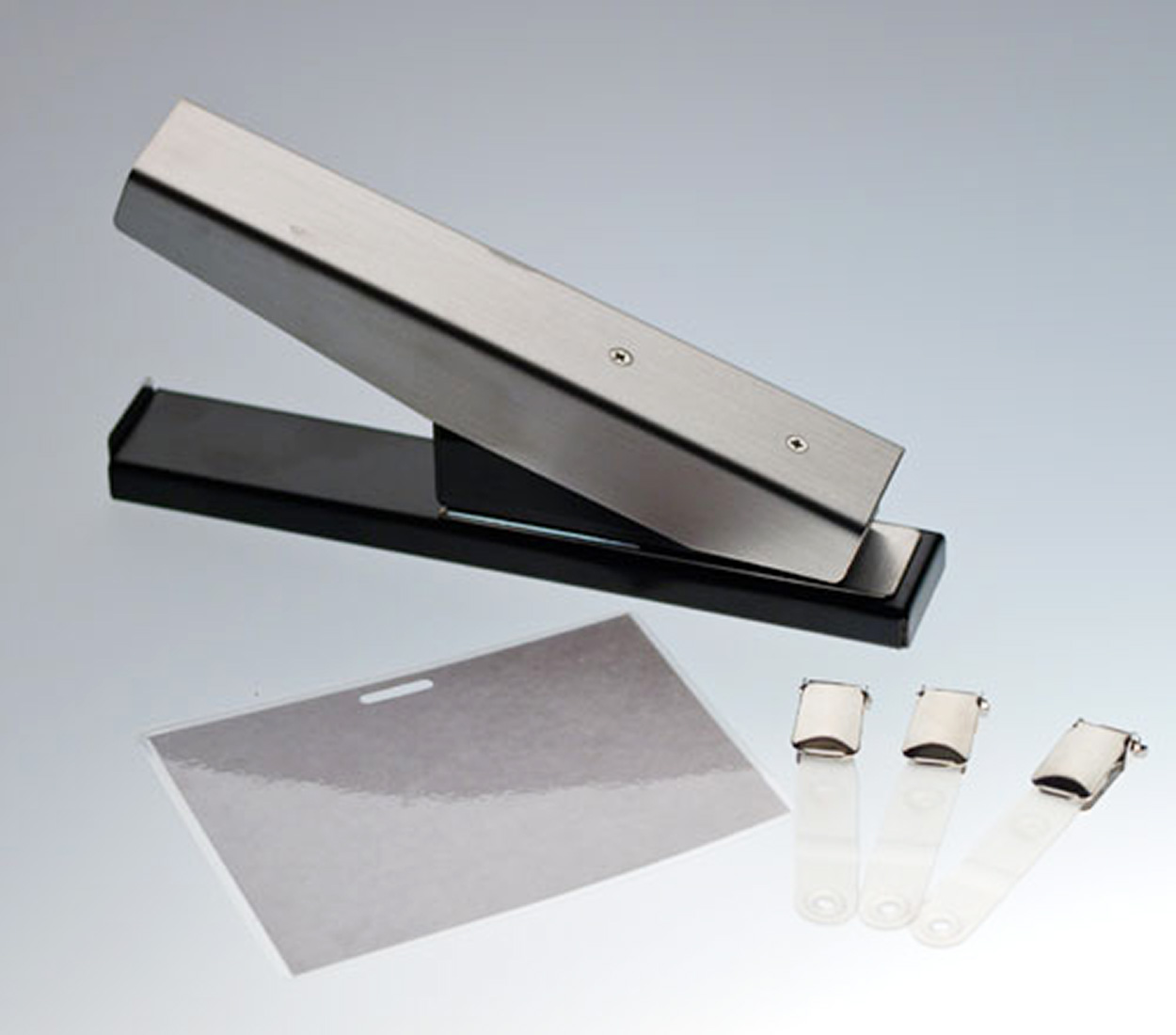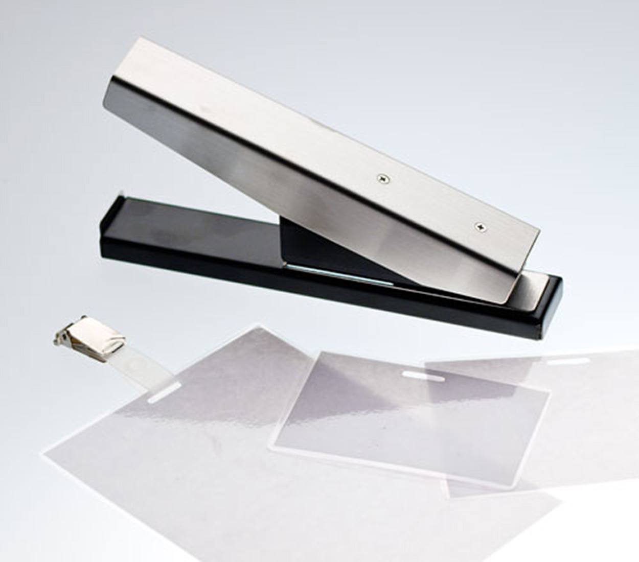 Manuelle Langlochstanze für Ausweis-Clips. Sie möchten gerne Ausweis-Clips befestigen? Diese Maschine stanzt das erforderliche Langloch (15 x 3 mm) für einen Ausweis-Clip.