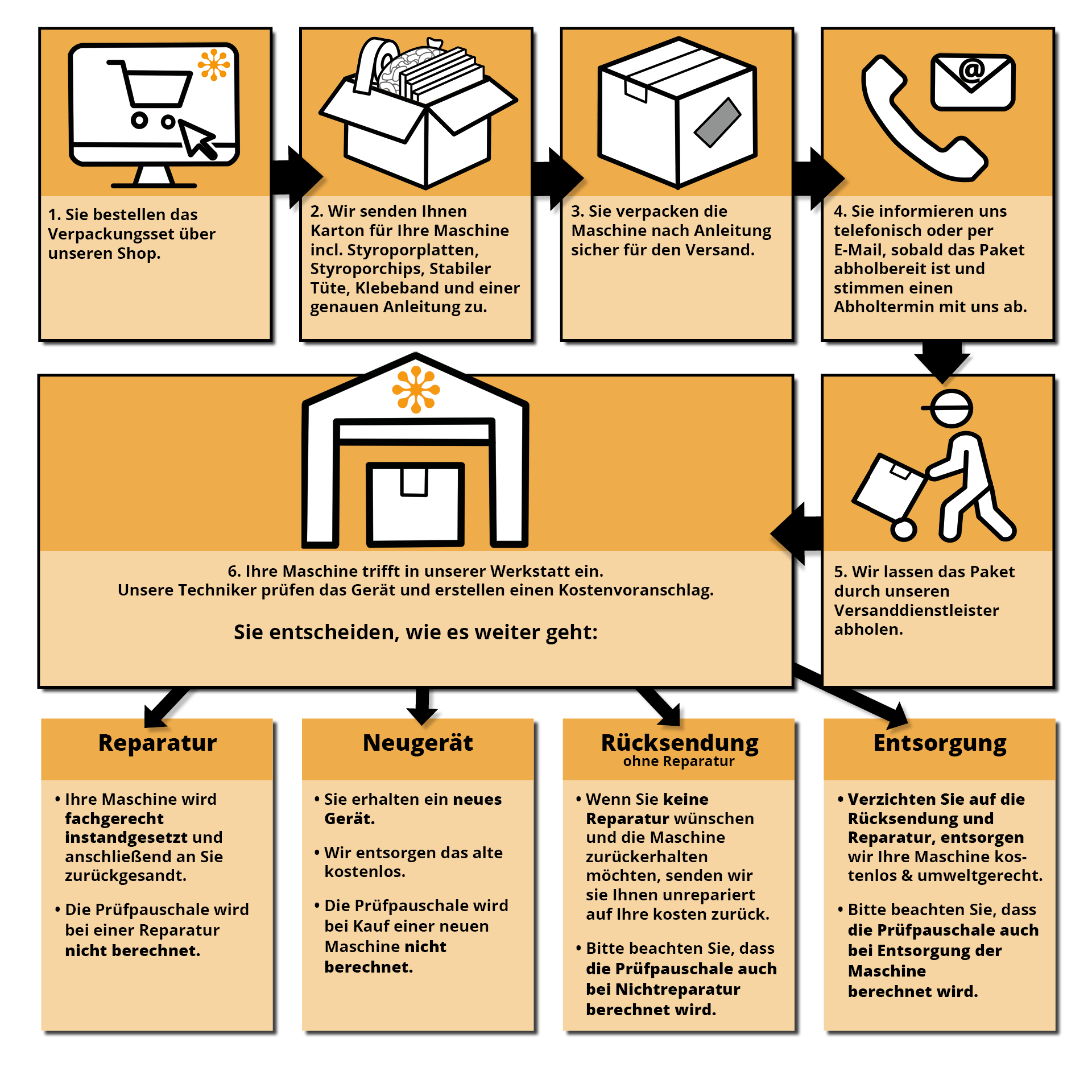 ⤷ Reparatur: Ihre Maschine wird fachgerecht instandgesetzt und anschließend an Sie zurückgesandt. Die Prüfpauschale wird bei einer Reparatur nicht berechnet.